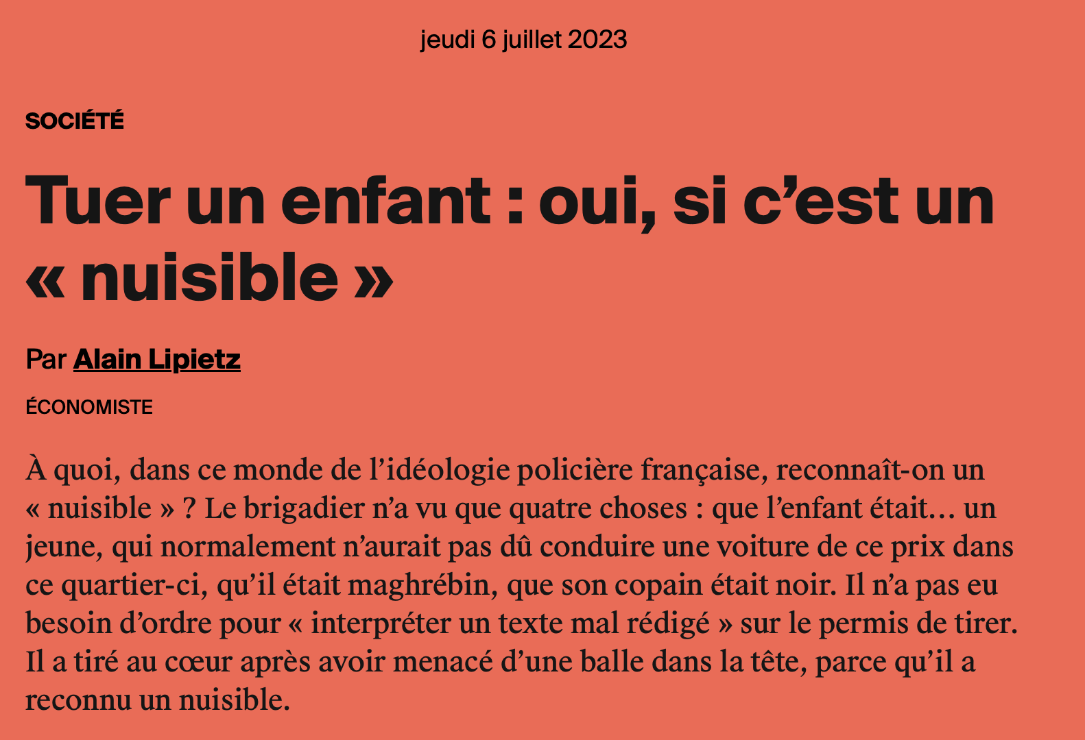 par Alain Lipietz | 1er juillet 2023 6 juillet 2024 Tuer un enfant : oui, si c’est un « nuisible ». Version modifiée publiée sur AOC-Media le 6 juillet.